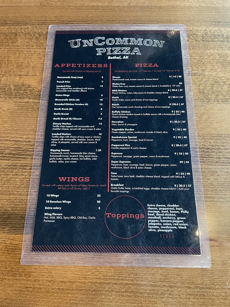 Welcome to UnCommon Pizza 49, a vibrant eatery located at 401 Chief Eddie Hoffman Hwy, Bethel, AK. This restaurant is a haven for pizza lovers, offering a diverse menu that extends beyond just classic pies. Indulge in their specialty pizzas, featuring mouthwatering options like BBQ Chicken, Taco, and a flavorful Super Supreme, with prices starting at just $8.00. For those looking for a twist, there's even a gluten-free pizza at $20.00.